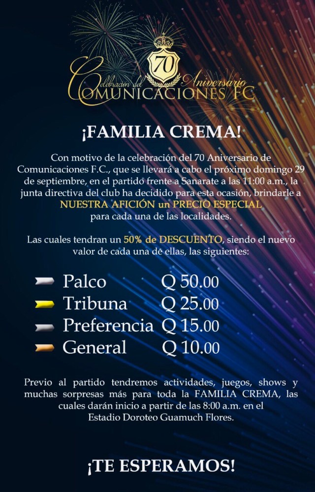 El equipo de Comunicaciones celebrará este domingo su 70 aniversario, cuando reciba al equipo de la máquina celeste de Sanarate , partido programado a las 11 horas en el Estadio Nacional Doroteo Guamuch Flores.