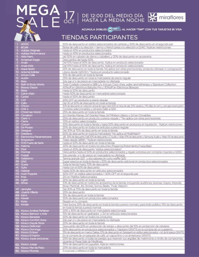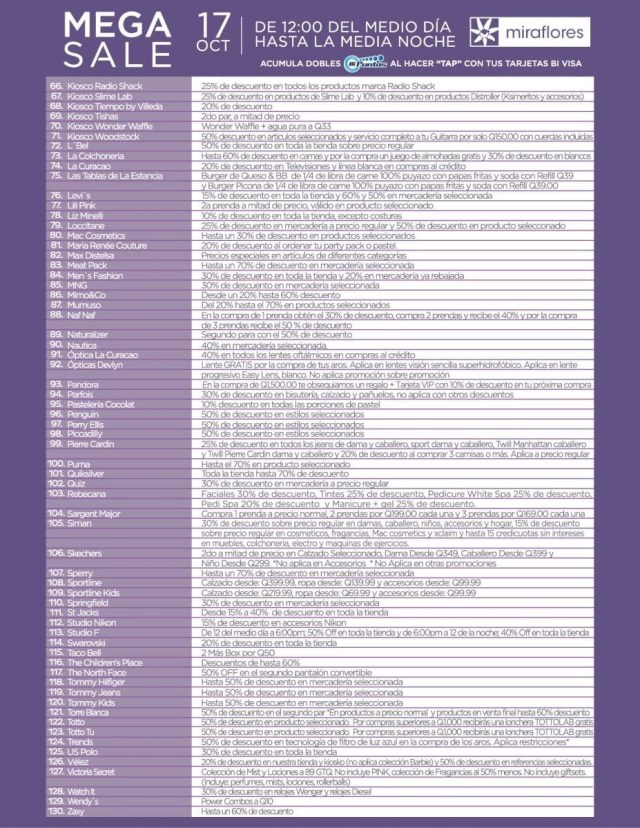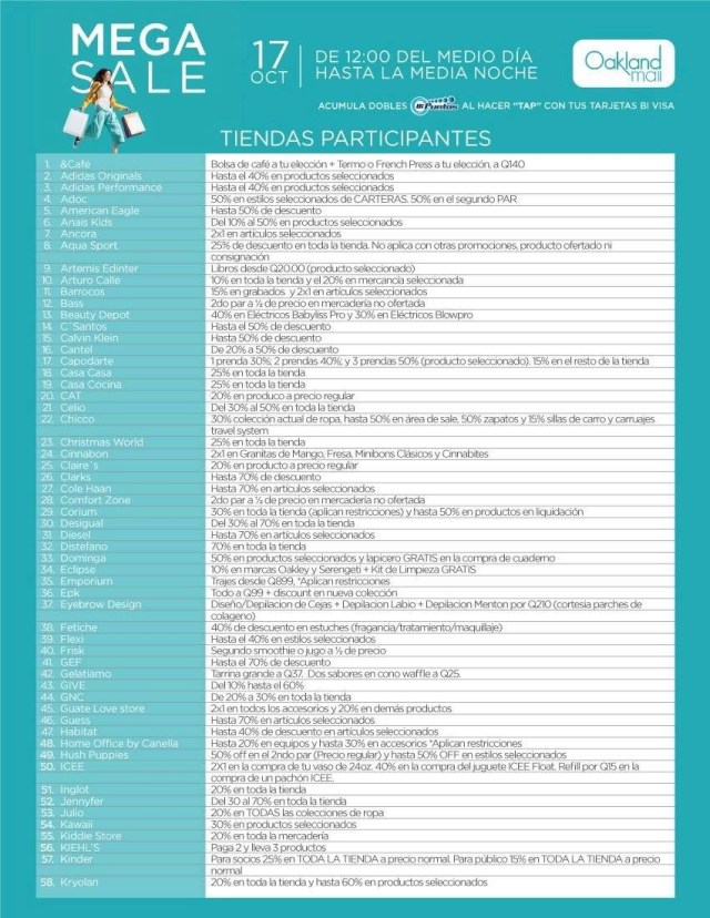 En este increíble evento podrás encontrar durante 12 horas descuentos de hasta el 70% en más de 200 tiendas en los centros comerciales Miraflores y Oakland Mall. Adicional, se vivirá un ambiente de fiesta ya que se contará con música en vivo y un área VIP para los clientes que presenten sus facturas de compra de los establecimientos participantes.